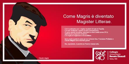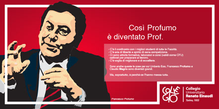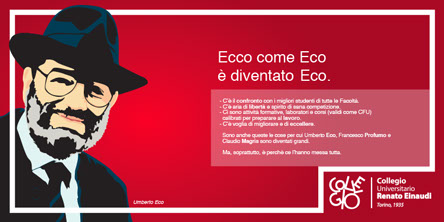 Una buona strada per colpire l’attenzione consista nel comunicare ai ragazzi le qualità di Collegio, attraverso l’uso di testimonial, è proprio il caso di dirlo, di eccellenza, quali: Umberto Eco, Francesco Profumo e Claudio Magris. Il titolo suggerisce provocatoriamente Collegio come la ragione del loro successo; il testo argomenta questa asserzione e la giustifica con un invito all’impegno in conclusione.